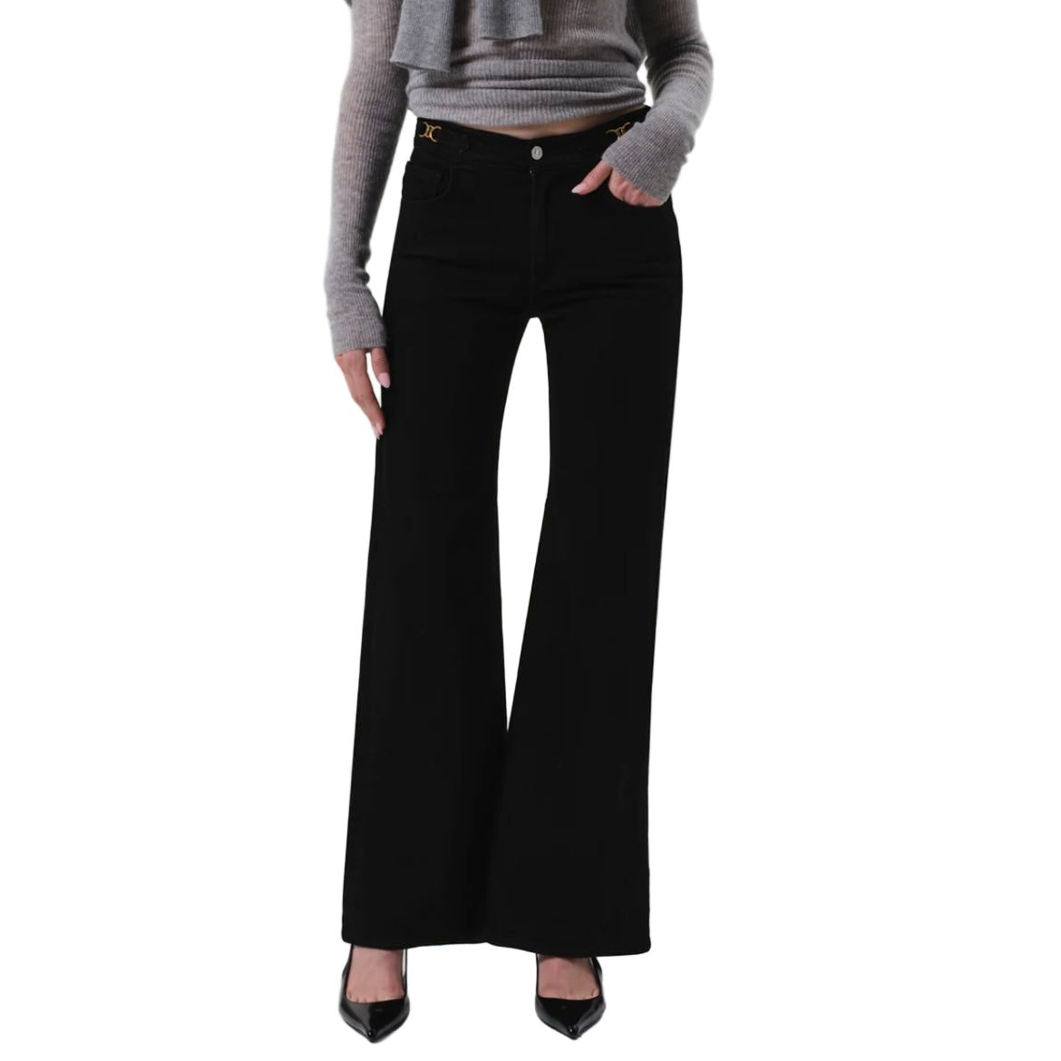 Looks Like: Clean dark rinsed out indigo denim pant with horsebit detailing at the waist