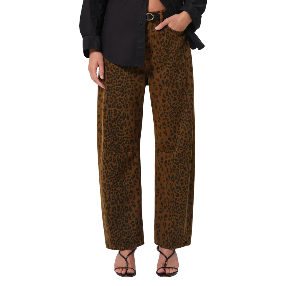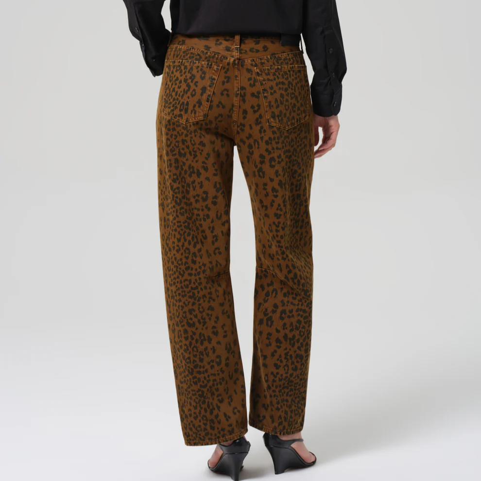 A low-slung relaxed jean crafted from rigid, non-stretch denim for a structured yet effortless feel. The silhouette tapers to the ankle, creating a clean, contemporary line. Dark brown denim with subtle black cheetah print detailing brings a refined, unexpected touch—perfect styled with minimal layers and sleek footwear for a polished, modern look.