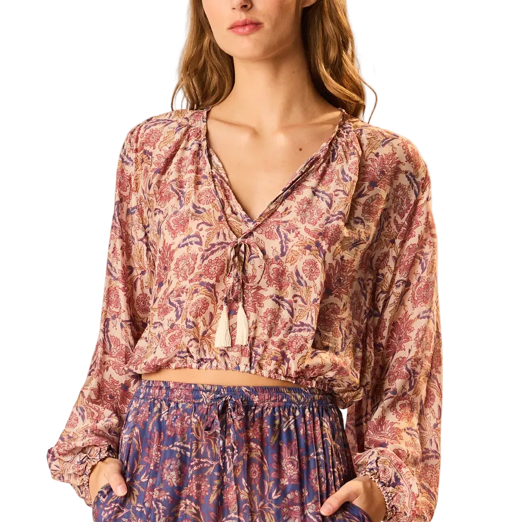 • Cropped long-sleeve top with v-neckline and tie closure.