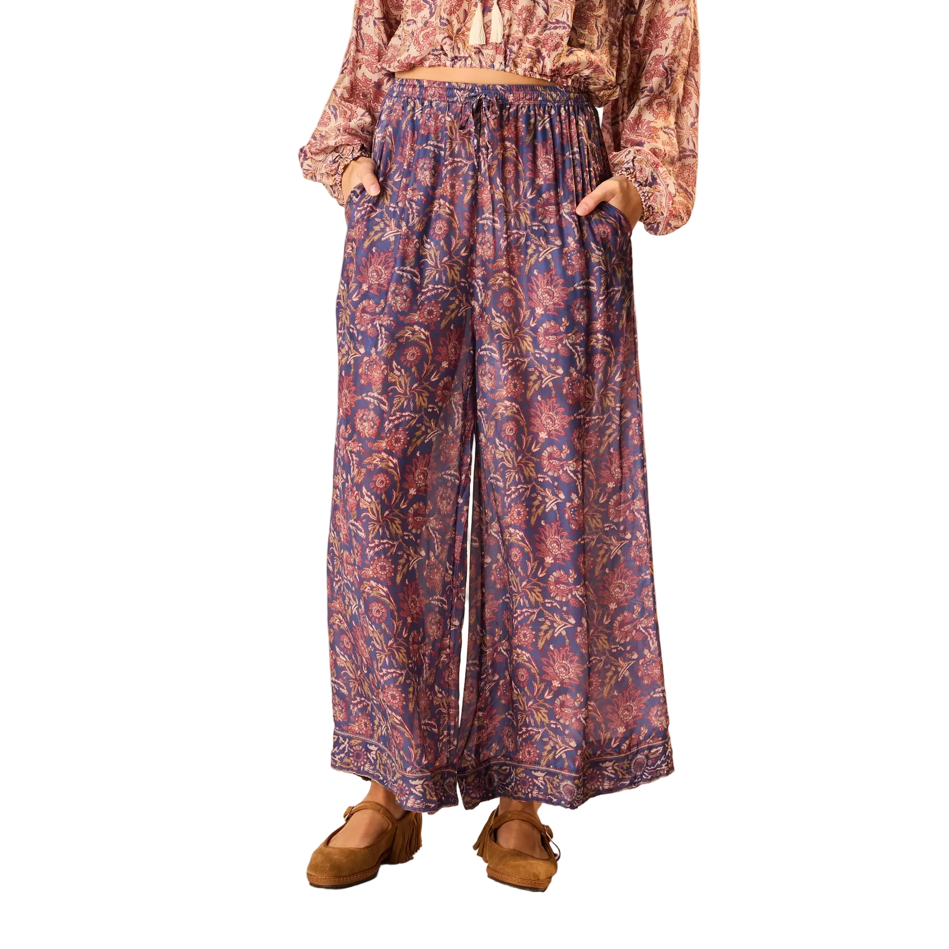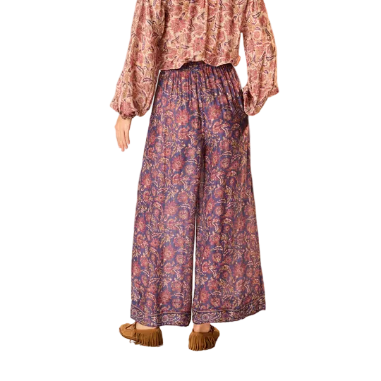 - Cased elastic waist with tasseled tie, pockets, and loose wide legs.