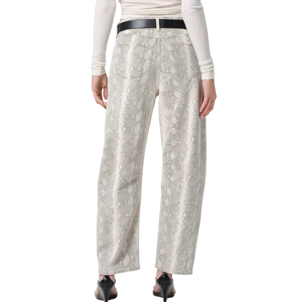 The Miro Long offers a modern, relaxed take on the tapered silhouette with a subtle barrel leg and elongated lines. Crafted from rigid, non-stretch denim with an authentic hand, this version features a white and grey python print that adds a bold, refined edge. A statement piece that balances structure, texture, and effortless wearability.