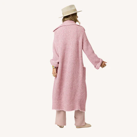 - Shaker - stitch duster long cardigan with collar and buttons. Whipstitch detailing, stitched heart on the sleeve, and Imperfect Heart patches on the elbows.