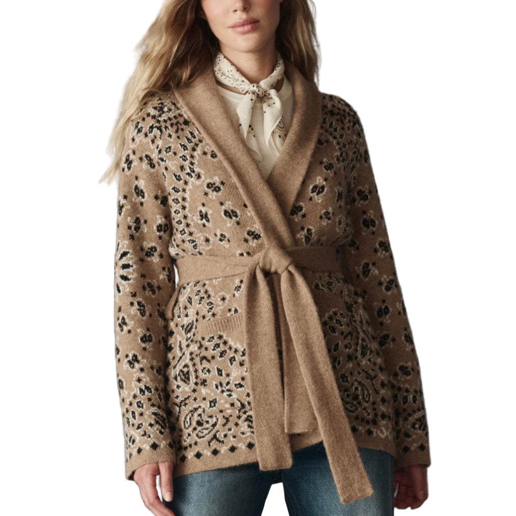 Rooted in the spirit of the American West, this shawl-collar cardigan features a bandana motif spun with traditional jacquard techniques. Long and easy to layer, it can be worn open or tied at the waist with its self-belt. Crafted from a soft wool blend, it’s an effortless layering piece that carries the warmth of the season.