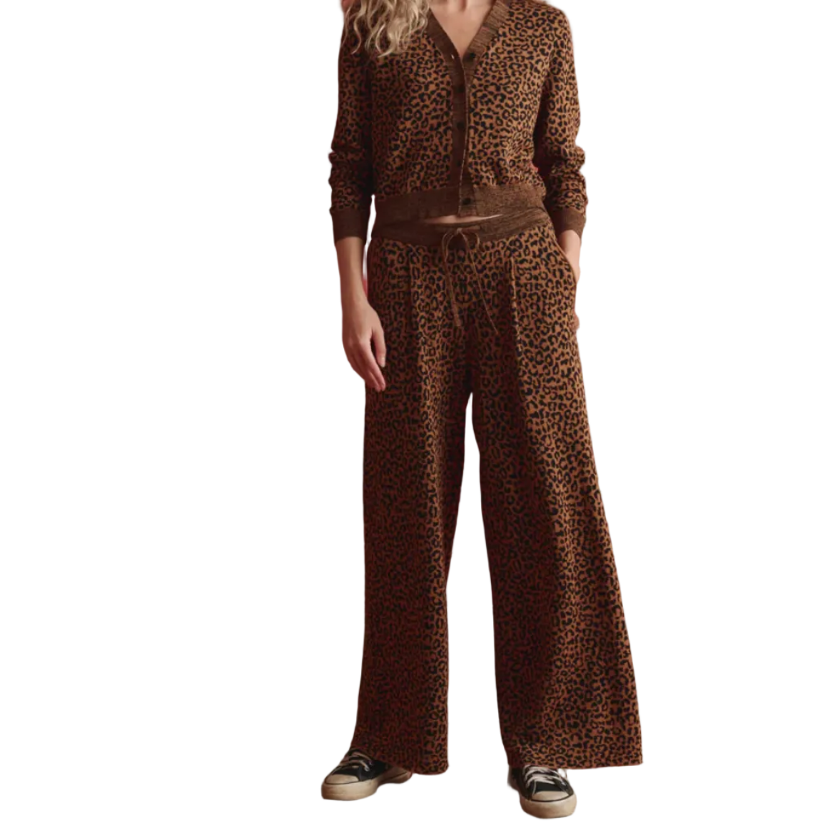 The Relaxed Trouser Pant is an easy pull-on pant designed with a wide leg and long inseam for an effortlessly relaxed silhouette. Soft pleats at the waist add subtle structure, while a ribbed waistband with a delicate tie ensures comfort and ease. On-seam pockets at the hips offer everyday functionality. This pant pairs perfectly with The Shrunken V-Neck Cardigan. This season, it's knit from a fine-gauge cotton yarn in a classic leopard.