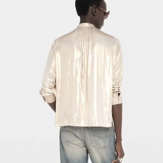 Satin blouse with open collar, long sleeves and gathered details.