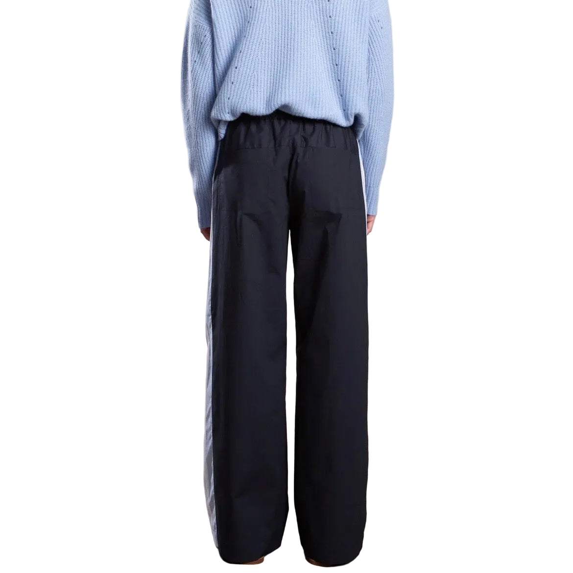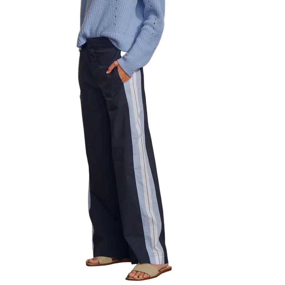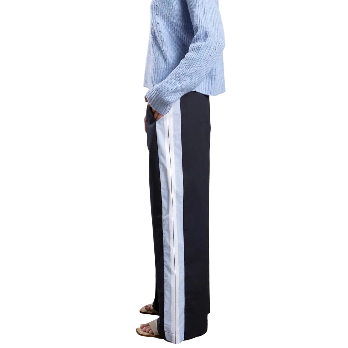 Wide-leg trouser in stretch cotton poplin with striped blue and white side panel. Has a clean flat-front waistband and elastic in back for ease of wear.