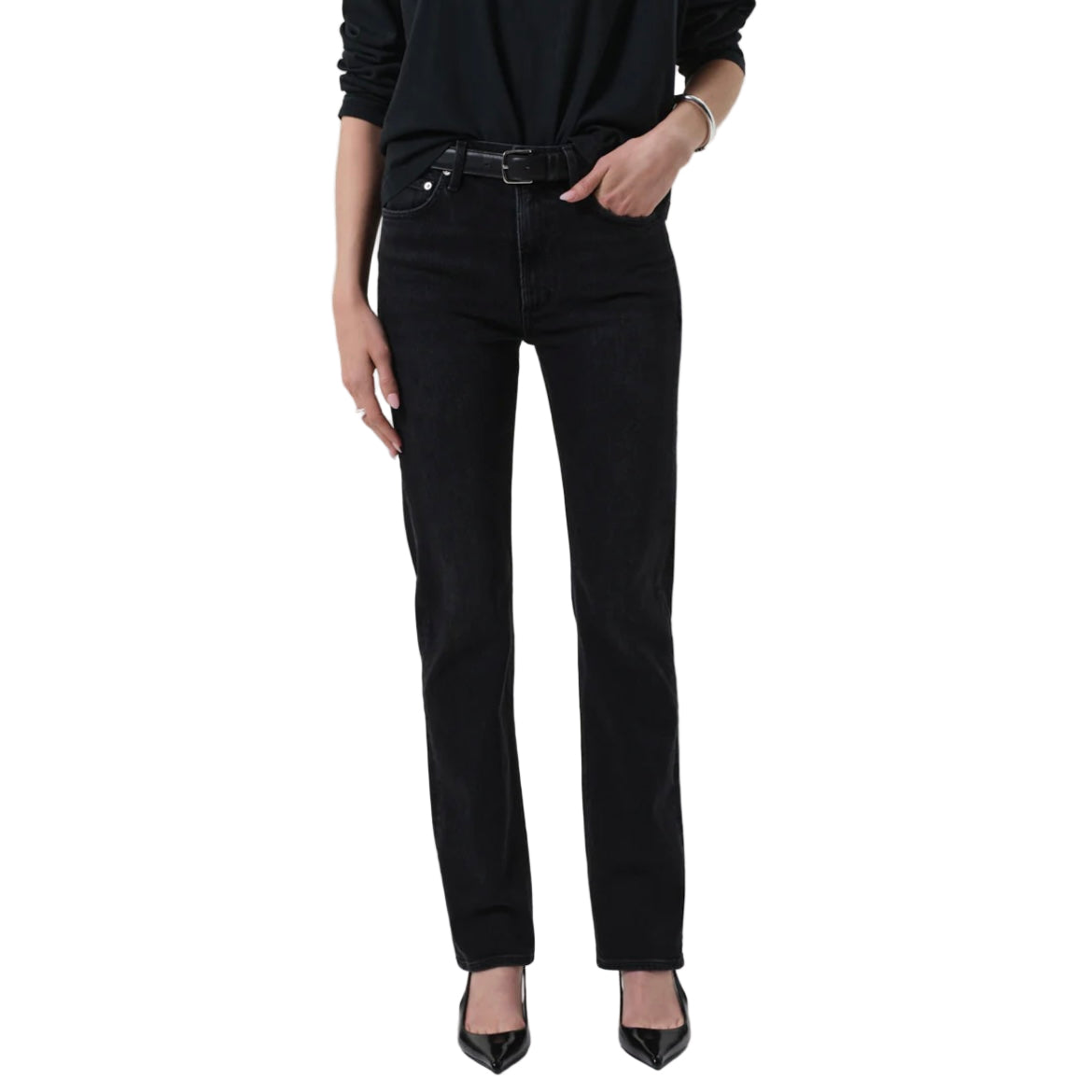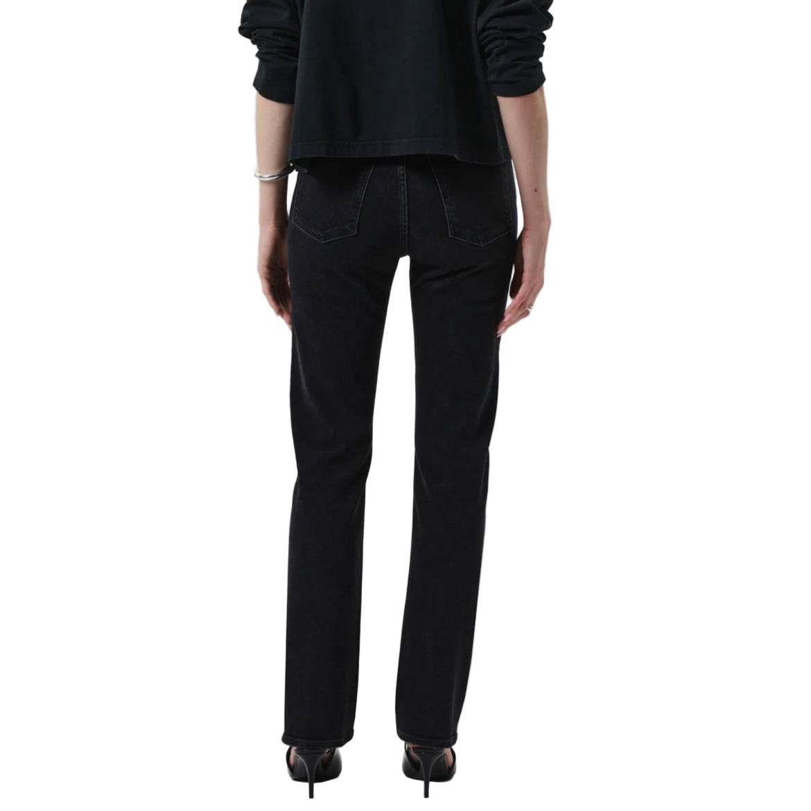 The ‘Zurie’ offers a polished straight leg with a soft, broken-in feel. Crafted from comfort stretch denim made with regenerative cotton, the silhouette sits high on the waist and falls clean through the leg. A rich, washed black finish adds modern edge—perfect with everything from boxy knits to sharp outerwear.