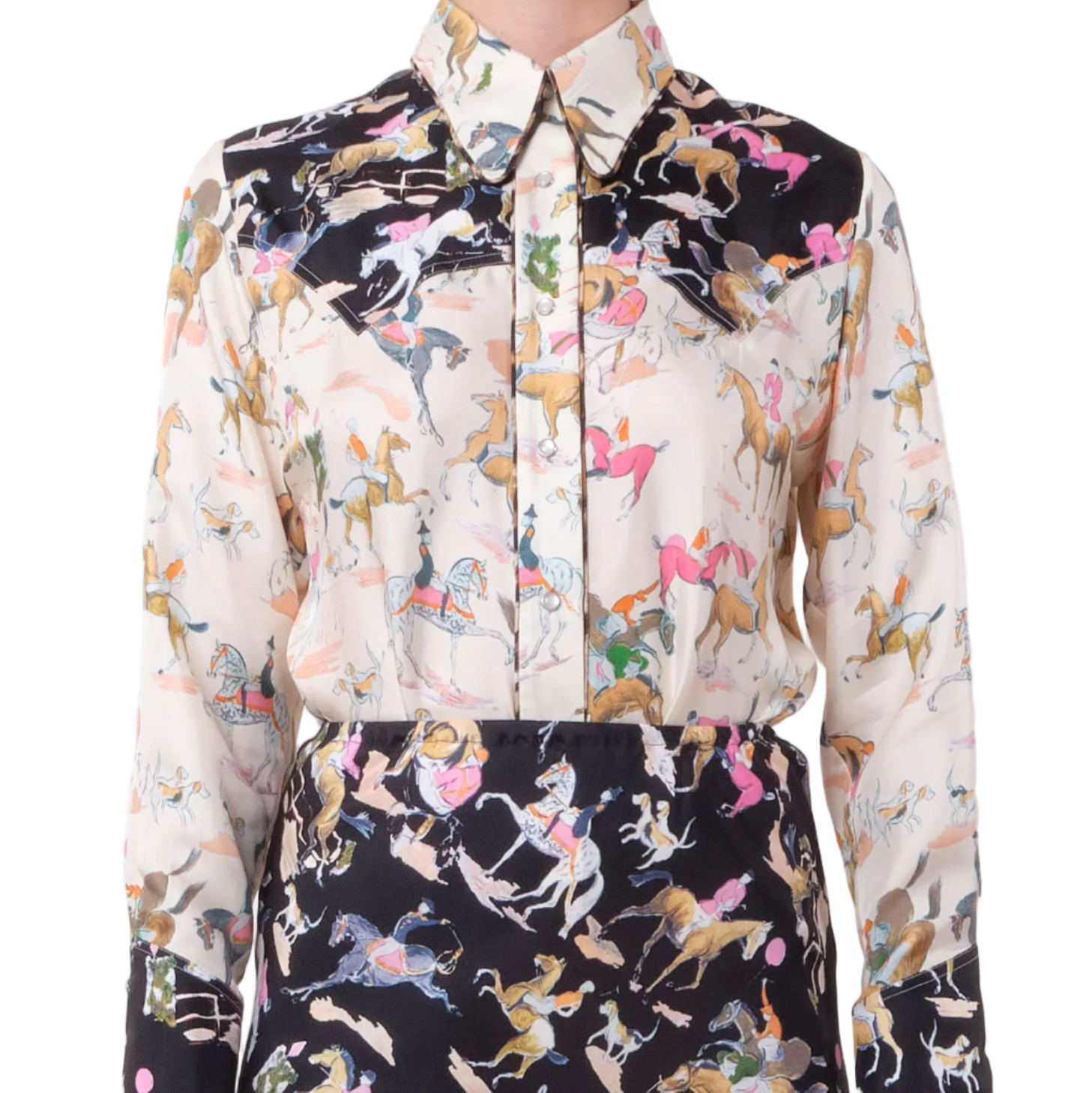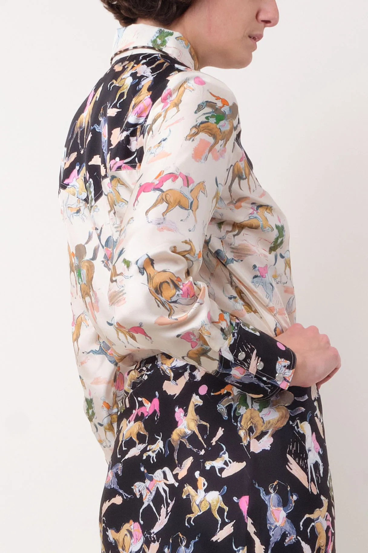 Long-sleeved shirt in silk twill, contrasted western style yokes and cuffs, piping details in Panther along button pad and collar, snap buttons. Exclusive print “Cavallo” in two colors.100% silk twill.