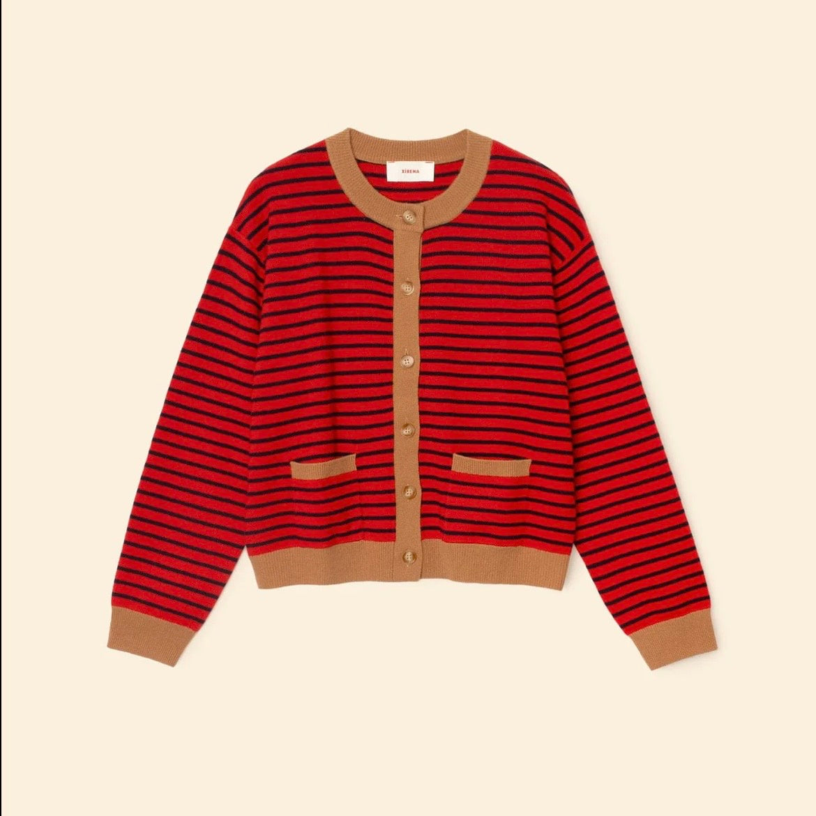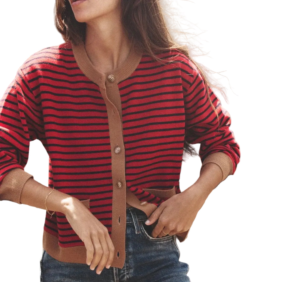 Striped Delight. Lillian is new this season in our ultra-soft striped cashmere wool blend. This cardigan sweater features contrast color ribbed trim at the neck, cuffs, pockets, and hem.